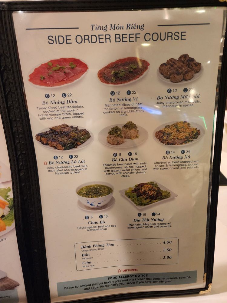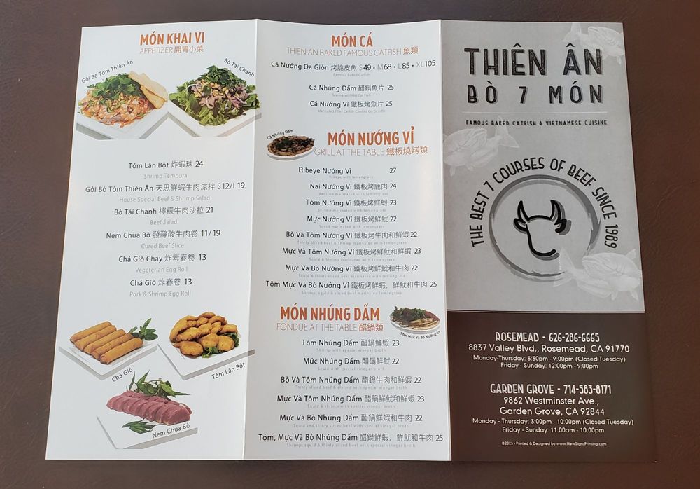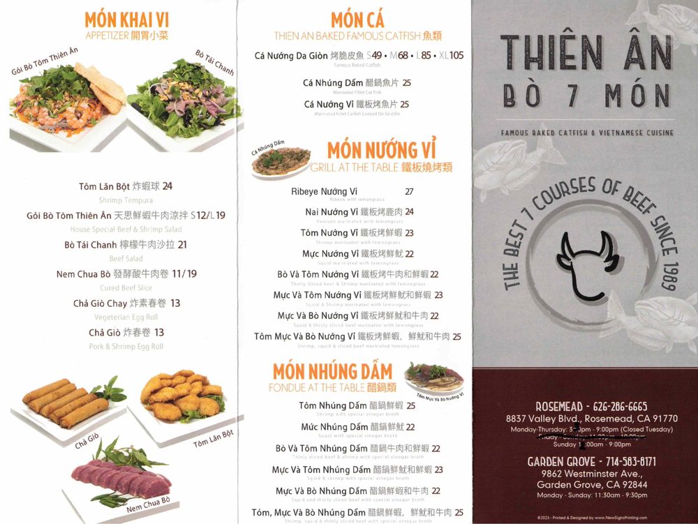 Thien An Bo 7 Mon, a Vietnamese restaurant in Rosemead, CA, offers a variety of traditional dishes with a modern twist. With a focus on customer satisfaction, the restaurant provides vegan and vegetarian options, wheelchair accessibility, and dog-friendly seating. The menu features 7-course beef and baked catfish, which are highly recommended by patrons for their flavorful taste and generous portions. The restaurant's attentive staff and cozy ambiance make it a great choice for group gatherings and family dinners. The catfish dishes are praised for their freshness and quality, though some customers mention a preference for dining in due to the intricate preparation involved. Overall, Thien An Bo 7 Mon stands out for its delicious food, friendly service, and unique dining experience.